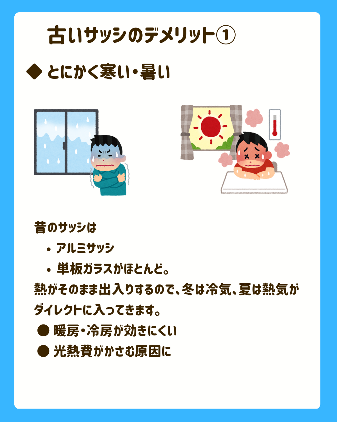 昔のアルミサッシと一枚ガラス(単板ガラス)は、外の熱をそのまま通してしまいます。