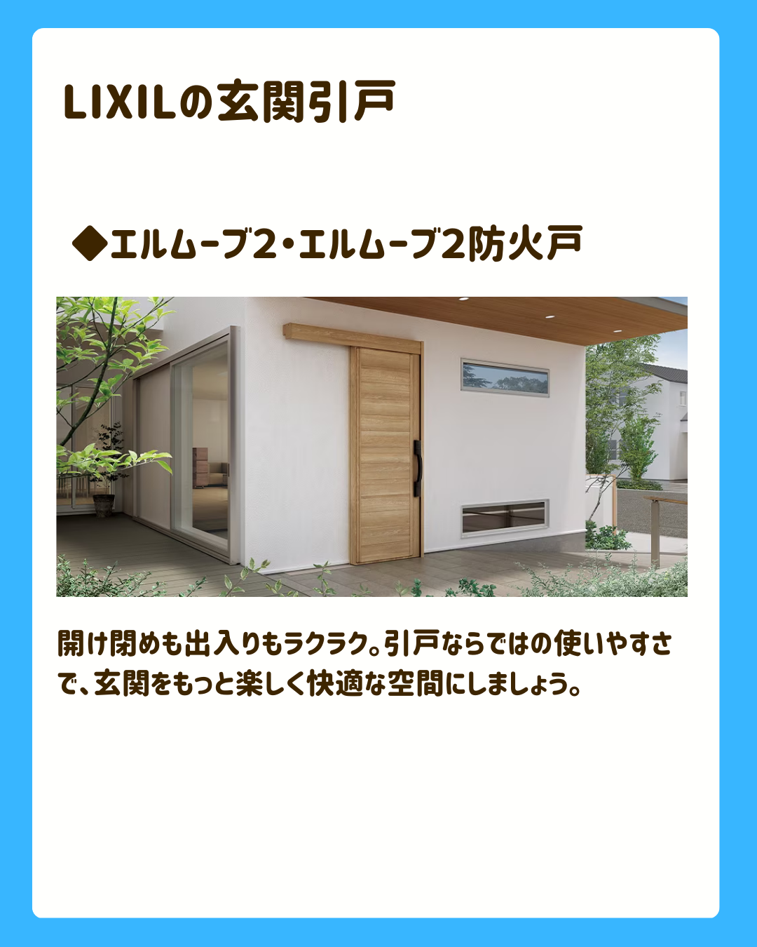 LIXILの玄関引戸エルムーブ2・エルムーブ2防火戸は、和風からモダンなデザインまで幅広く選ぶことができます。