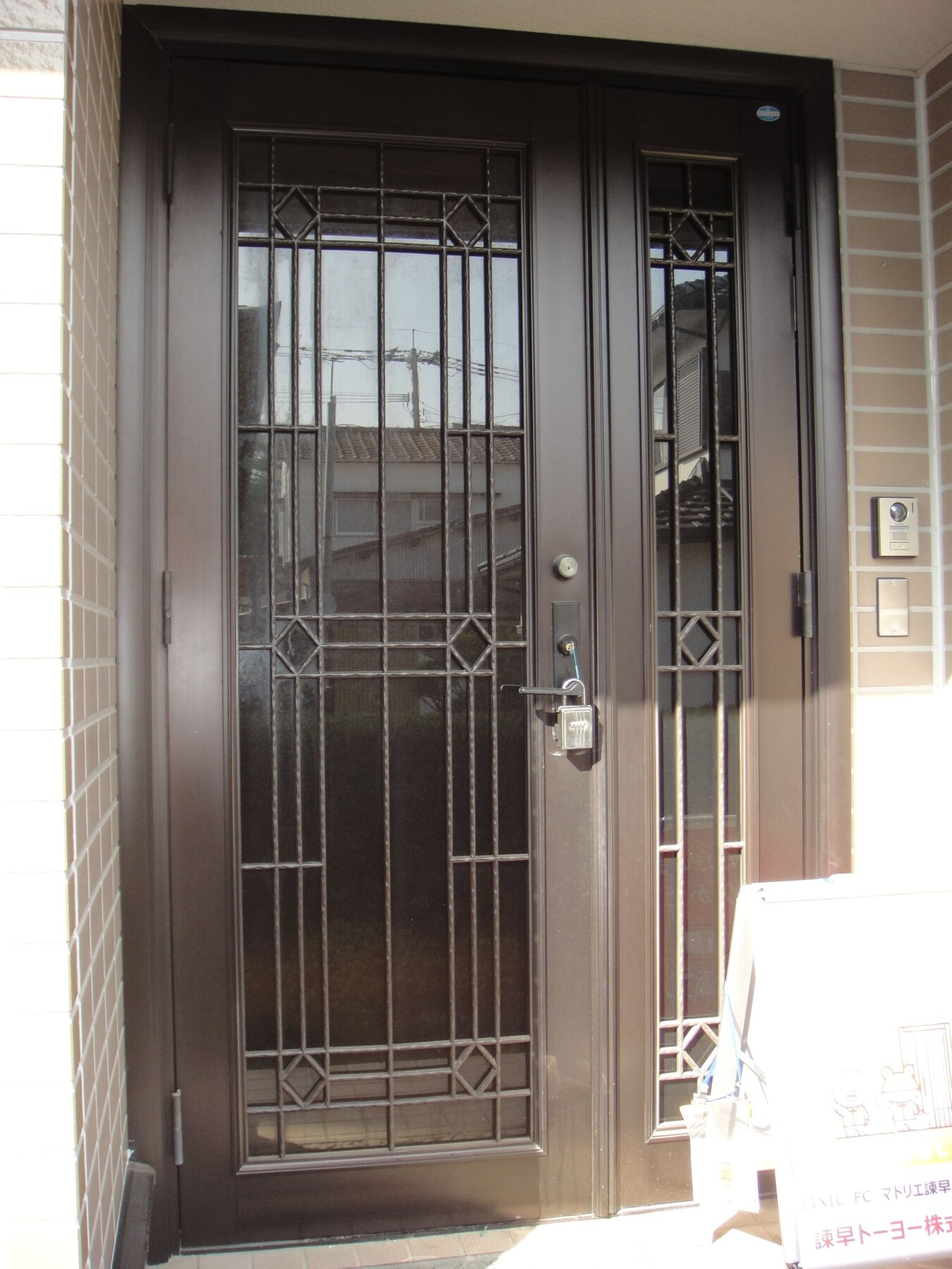 クラシカルな雰囲気だった玄関ドアが、自然なあたたかみのある木目調のドアになりました。